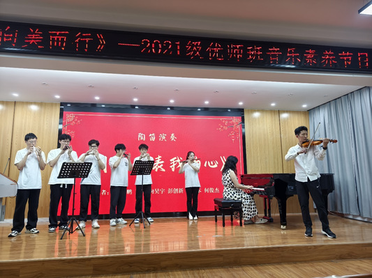 本网讯(通讯员 韦也纳 娄冬)6月14日晚,来自2021级数学与统计学院、物理与机电工程学院、教育科学学院的第一届“优师计划”班非音乐专业同学举行了以“乐海拾贝,向美而行”为主题的音乐素养节目展演,通过唱歌、跳舞、朗诵、乐器合奏等形式来展示两年的音乐素养课程的训练成果。