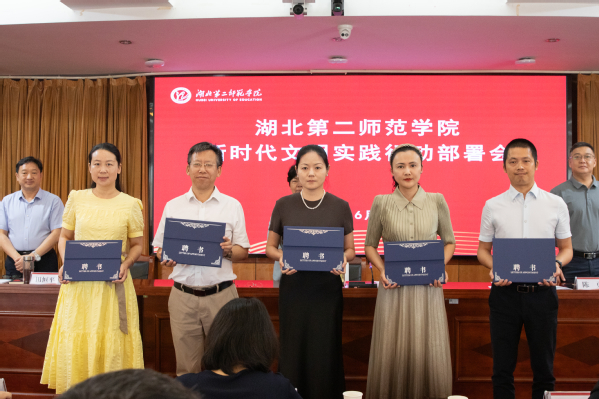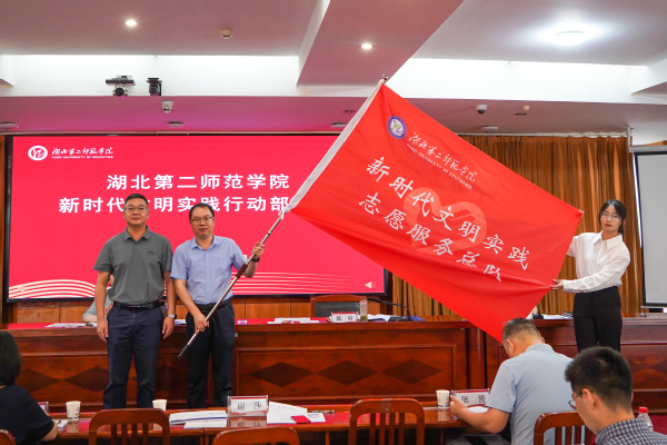 新闻中心主任、宣传部副部长谢莎解读学校《新时代文明实践行动方案》。陈勇为“新时代文明实践志愿服务总队”授旗,校团委书记刘锐接旗。艺术学院副院长赵文、文学院院长龙珍华分别代表团队发布校园视觉形象识别系统和新修订的校园命名系统。