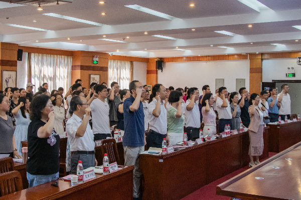 在聆听了“荆楚好老师”、计算机学院副院长王海军教授,省级高层次人才代表、物理与机电工程学院戴楚博士,最美辅导员、马克思主义学院副教授樊勇发言后,全体新教师在省级名师代表、新闻与传播学院院长陈瑛教授带领下庄严宣誓。