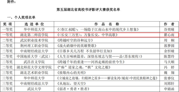 本网讯(通讯员陈雯 刘晓静)近日,第五届湖北省高校书评影评大赛奖项评选结果出炉,我校文学院瞿心雨同学原创作品《<长安三万里>:万象长安,中华高歌》荣获大赛一等奖,图书馆刘莹老师获“优秀指导老师”称号,图书馆获优秀组织奖。