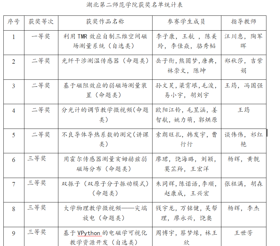 本网讯(通讯员 王筠)第九届“优利德杯”湖北省大学生物理实验创新设计竞赛于7月13日至15日在武汉举行,我校物理与机电工程学院选派的12支队伍有9支队伍分别获得一等奖1项、二、三等奖各4项的好成绩。