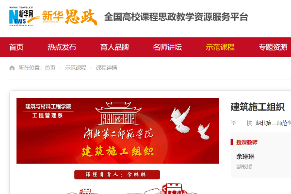 本网讯(通讯员 杜文娟) 近日,我校余琳琳副教授的《建筑施工组织》课程思政教学案例上线新华网“新华思政”平台。