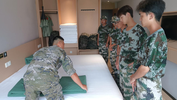 带训辅导员辛雯表示:“以军训为契机,对学生宿舍内务整理提出高标准、严要求,加强学生的卫生意识,通过实际行动学习军人优良的作风,更有助于培养学生良好的行为习惯和专注负责的处事态度。”(新闻中心编辑 程丽鹃)