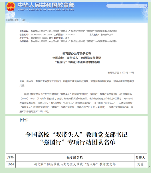 本网讯(通讯员 卢郅睿)近日,教育部办公厅及省教育工委公布了全国、全省高校“双带头人”教师党支部书记“强国行”专项行动团队名单,我校马克思主义学院“黄大年”教师党支部入选全国“双带头人”教师党支部书记“强国行”专项行动团队。这是教育部今年开展的首批“强国行”专项行动,是学校基层党组织建设在全国党建工作“教师双带头人”项目上的一次新突破。