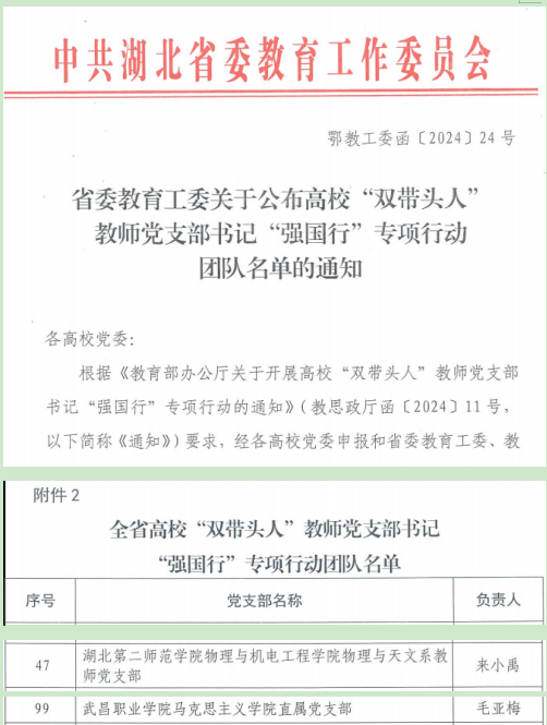 据悉,物理与机电工程学院物理与天文系教师党支部和武昌职业学院马克思主义学院直属党支部入选全省“双带头人”教师党支部书记“强国行”专项行动团队。(新闻中心编辑 程丽鹃)