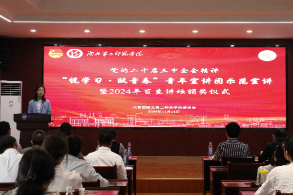 本网讯(通讯员 海曦予 胡春琪)11月14日,党的二十届三中全会精神“悦学习·跃青春”青年宣讲团示范宣讲暨2024年“百生讲坛”颁奖仪式在S4210举行。校党委常委、副校长吕辉出席活动。学生工作部、团委负责人,各教学学院团委书记(负责人),党的二十届三中全会精神“悦学习·跃青春”青年宣讲团成员,团员青年代表参加活动,活动由校团委兼职副书记王一主持。