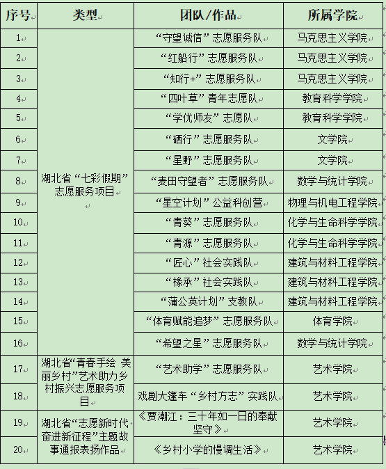 本网讯(通讯员 池家飞 陈俊涛)近日,团省委公布了2024年湖北省“七彩假期”志愿服务项目通报表扬名单,我校18支团队和2幅作品上榜,获全省通报表扬的团队数量位居全省高校第一。