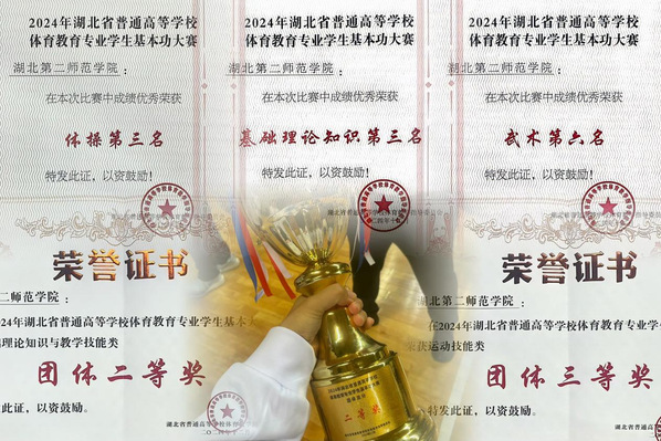 本网讯(通讯员 朱亚男)12月1日,由湖北省教育厅主办的2024年湖北省普通高校体育教育专业学生基本功大赛在江汉大学圆满落幕。我校代表队积极备战,奋勇拼搏,经过三天的激烈角逐,获基础理论知识第三名、体操第三名、武术第六名,基础理论知识与教学技能类二等奖、运动技能类三等奖、团体总分二等奖的优异成绩。