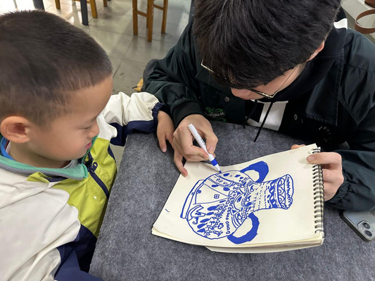 美术教室里更是其乐融融、充满创造力。2023级美术学专业孟晴天耐心地讲解绘画技巧。孩子们通过老师生动的示范与细致的指导,共同描绘出一幅幅充满童趣与想象力的作品,孩子们不仅提升美术素养,更提高了对艺术的追求。