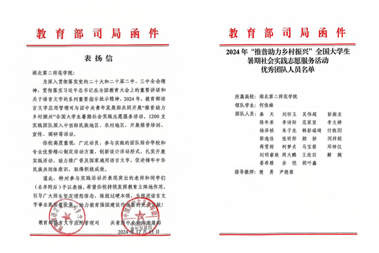 本网讯(通讯员 何佳琳)近日,学校收到教育部语言文字应用司和共青团中央青年发展部向学校发来的表扬信,我校马克思主义学院“守望诚信”暑期推普社会实践队在2024年“推普助力乡村振兴”全国大学生暑期社会实践志愿服务活动中的成绩突出,荣获“优秀团队”荣誉称号。