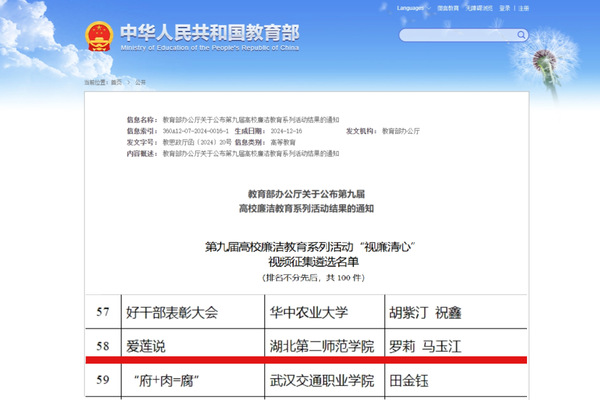 本网讯(通讯员 向羽蝶)近日,教育部办公厅公布了第九届高校廉洁教育系列活动评选结果,我校报送的舞蹈视频《爱莲说》成功入选全国100件“视廉清心”创意征集优秀作品名单。