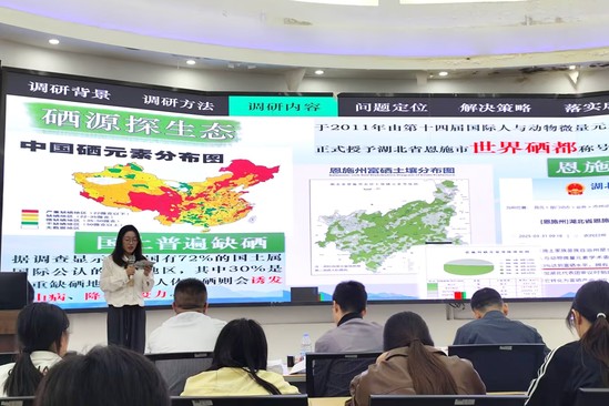来自13个学院的21支实践团队,分别围绕实践主题、团队构成、活动开展、特色打造、成果转化及应用、下一步规划等方面作汇报展示。数学与统计学院“麦田守望者”团队坚守“将论文写在田间地头”的理念,分享十年“校地结对”实践模式;化学与生命科学学院“青源实践队”以“硒韵织文旅,康食缀行程”为方向,探秘“生命元素”硒、解锁健康新密码……各团队深入基层、走进乡村、贴近群众,充分运用专业知识开展社会服务与调研,生动展现我校学子昂扬的精神面貌、强烈的社会责任感与扎实的专业素养。