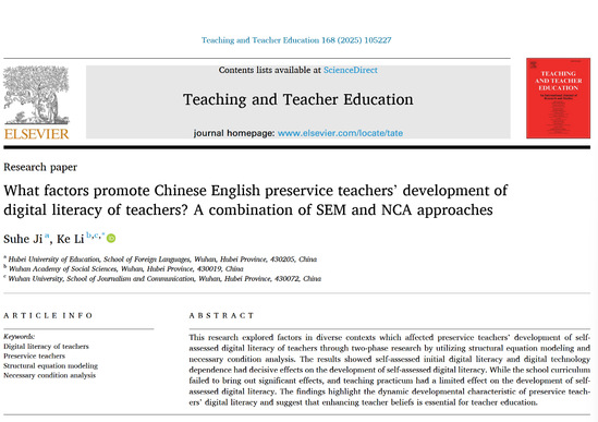 本网讯(通讯员 金汤)近日,外国语学院季苏鹤老师以第一作者身份(三码必中一码为第一单位),与武汉市社会科学院李轲博士合作,在教育学国际顶级权威期刊《教学与教师教育》(Teaching and Teacher Education)发表题为《哪些因素促进中国英语职前教师的教师数字素养发展?——基于结构方程模型(SEM)与必要条件分析(NCA)的混合方法》(What factors promote Chinese English preservice teachers’ development of digital literacy of teachers? A combination of SEM and NCA approaches)的研究成果。