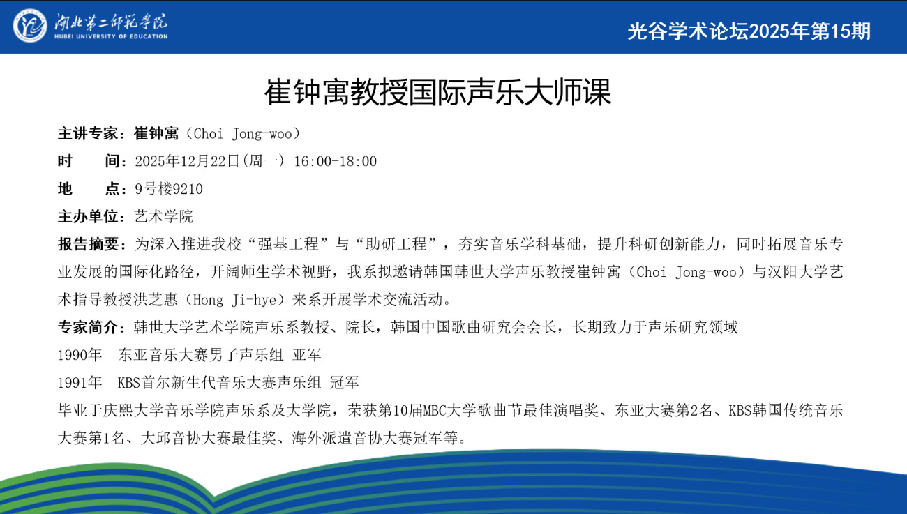 【光谷学术论坛预告】崔钟寓教授国际声乐大师课