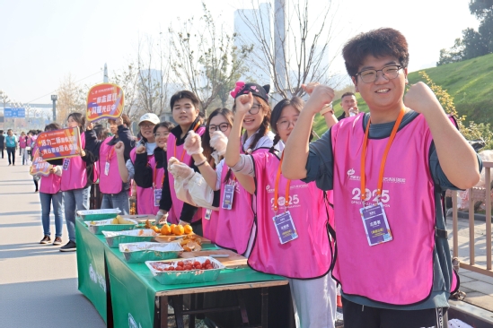 经过前期系统培训,志愿者们抵达现场后迅速分组协作,有序开展物资搬运、水桶清洗、海绵冷却、桌椅摆放及水杯布置等工作。寒风之中,大家配合默契、业务熟练,始终坚守岗位,以饱满的热情构筑起赛事保障的坚实防线。“选手们的笑容与点赞,让志愿服务格外有意义。”17.5公里处志愿者黄耀华分享道。