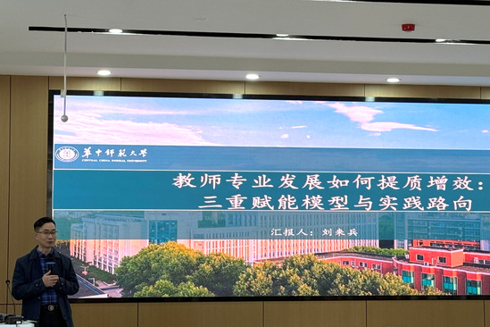专家报告环节,华中师范大学教授刘来兵以《教师专业发展如何提质增效:三重赋能模型与实践路向》为题,从研究背景、现实叩问、赋能模型、实践路向等方面作报告。其提出的三阶动力循环、三重赋能模型等内容获与会人员好评。