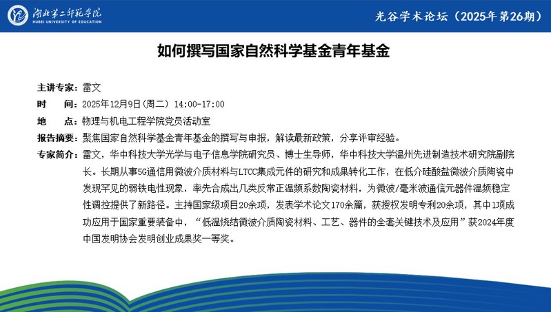 【光谷学术论坛预告】如何撰写国家自然科学基金青年基金