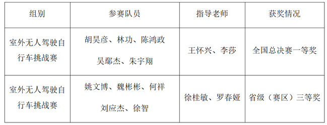 全国大学生智能汽车竞赛室外全国总决赛设室外ROS无人车赛、室外5G远程驾驶无人车赛、室外无人驾驶自行车挑战赛、室外智能驾驶挑战赛等四个赛项。我校物理与机电工程学院潜云机器人实验室派出两支队伍参赛。由王怀兴、李莎指导的“爱来自功哥”队,以赛区赛第六名的优异成绩晋级全国总决赛,并在决赛中再度突破,以总分第二名斩获大赛一等奖,实现我校在该赛事连续三年国赛获奖的佳绩。另一支参赛队获省级(赛区)三等奖。