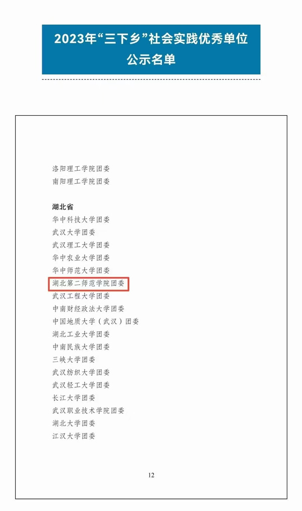 本网讯(通讯员 池家飞 张锐)近日,从团中央获悉,我校团委荣获2023年全国大学生暑期“三下乡”社会实践优秀单位,成为湖北省省属高校中唯一连续9年获此殊荣的学校。